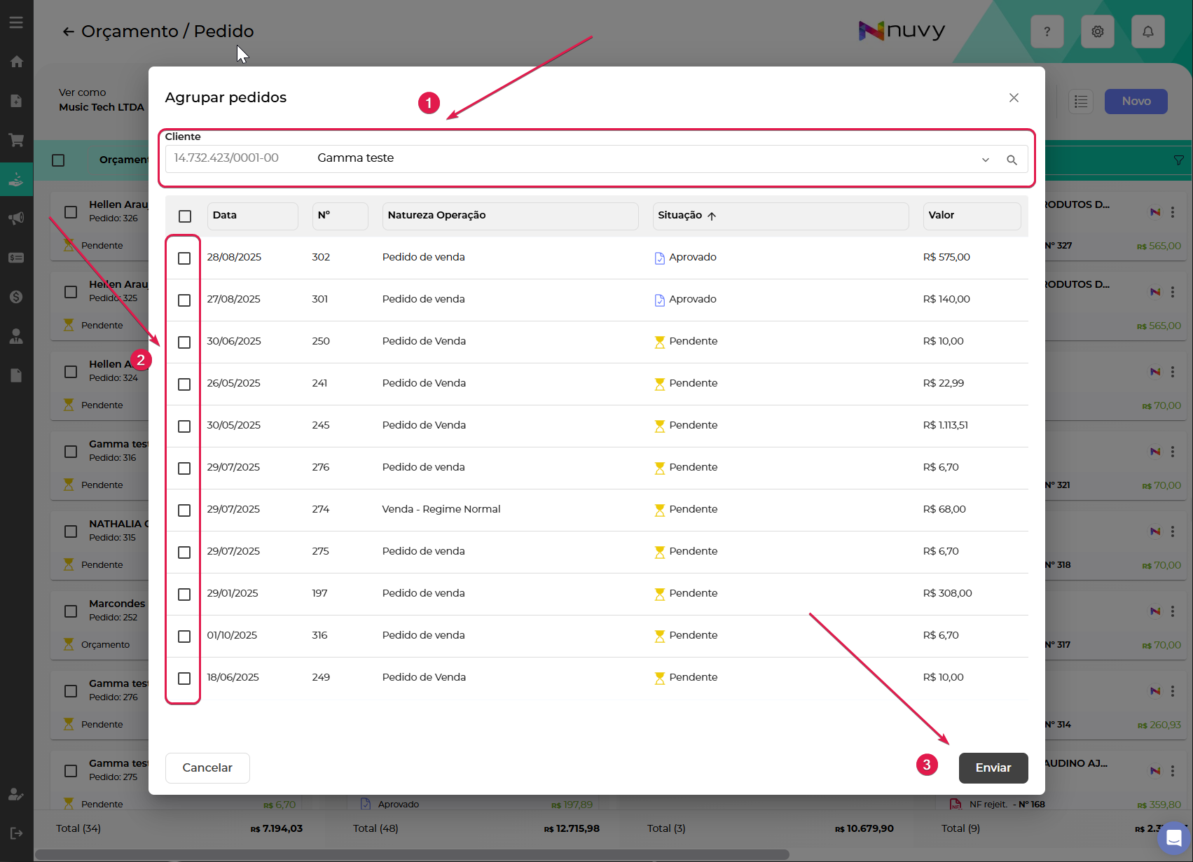 Depois disso é só marcar quais os pedidos que serão agrupados e clicar em enviar.