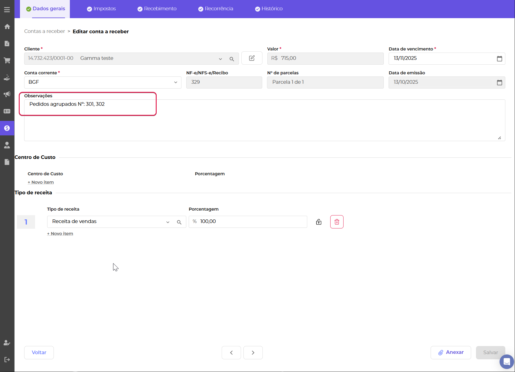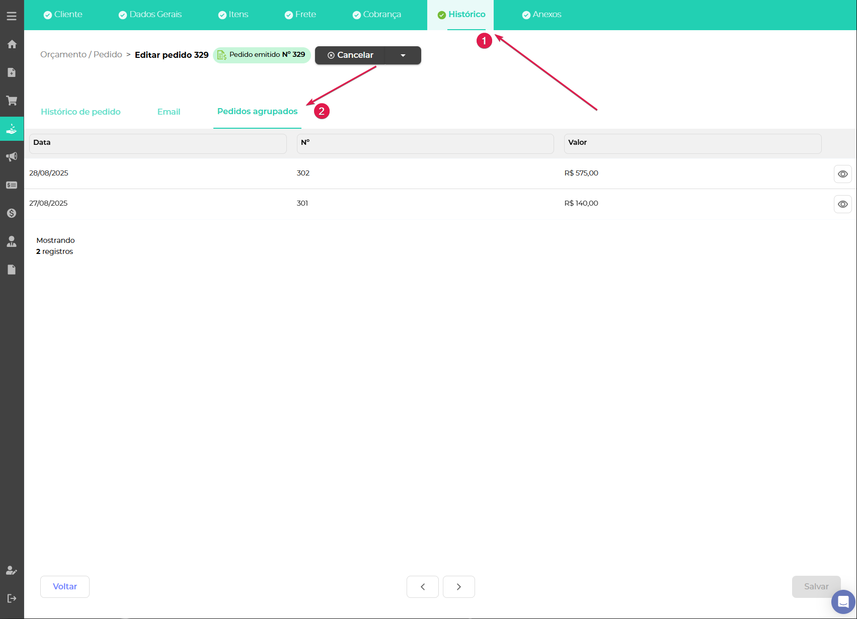 Ao clicar em enviar, você será levado para dentro do novo pedido, onde pode preencher as informações de recebimento na aba cobrança e também conferir quais os pedidos que foram agrupados nesse novo pedido na aba histórico > pedidos agrupados.