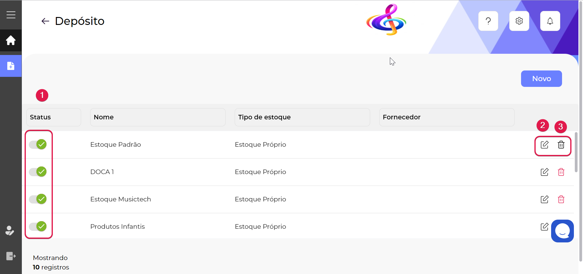 Status – Podemos desativar o depósito caso não haja mais movimentações com ele, dessa forma você mantém seus cadastros atualizados e preserva o histórico de transações.