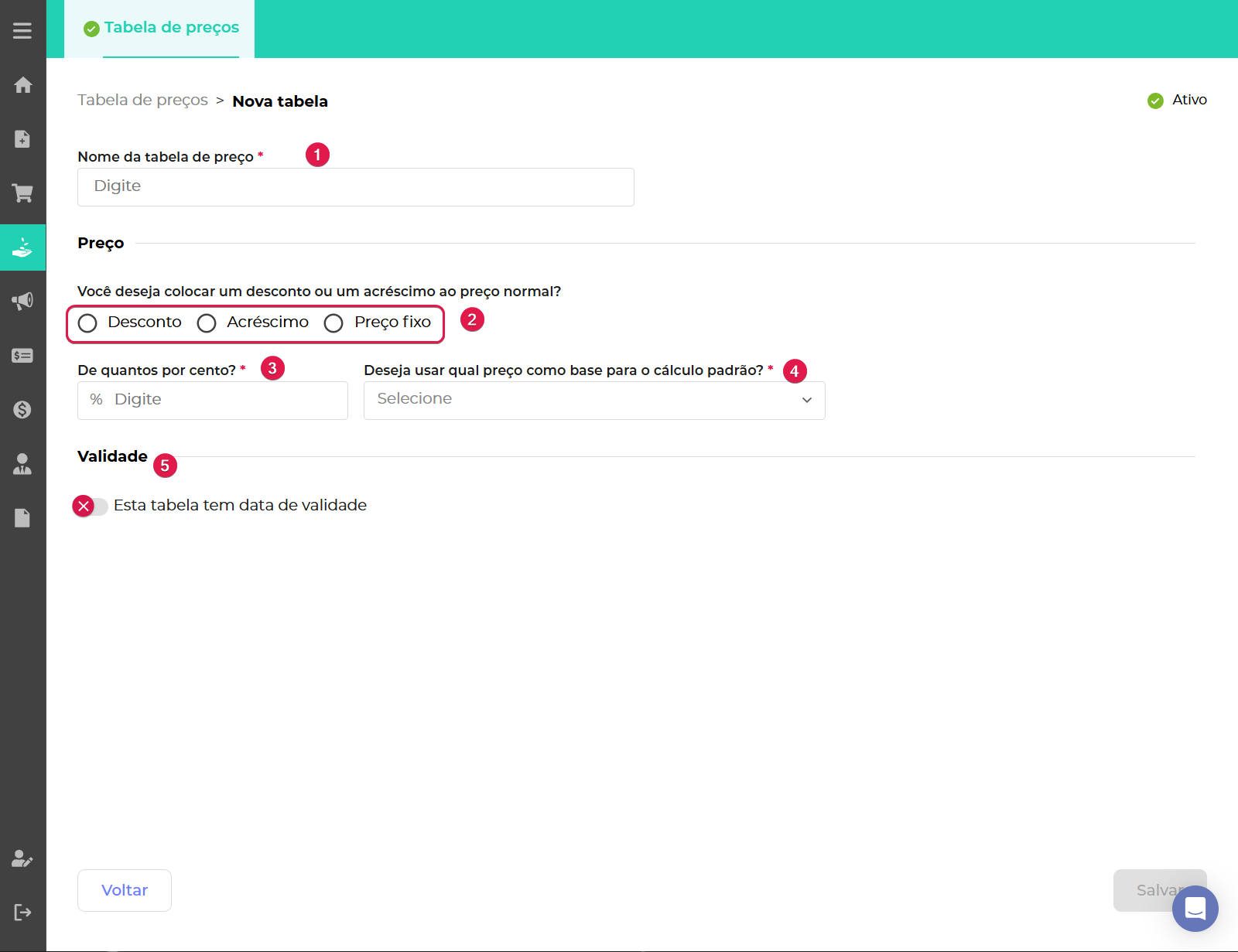 Preço – você deve selecionar se o cálculo da tabela será de um desconto ou acréscimo;