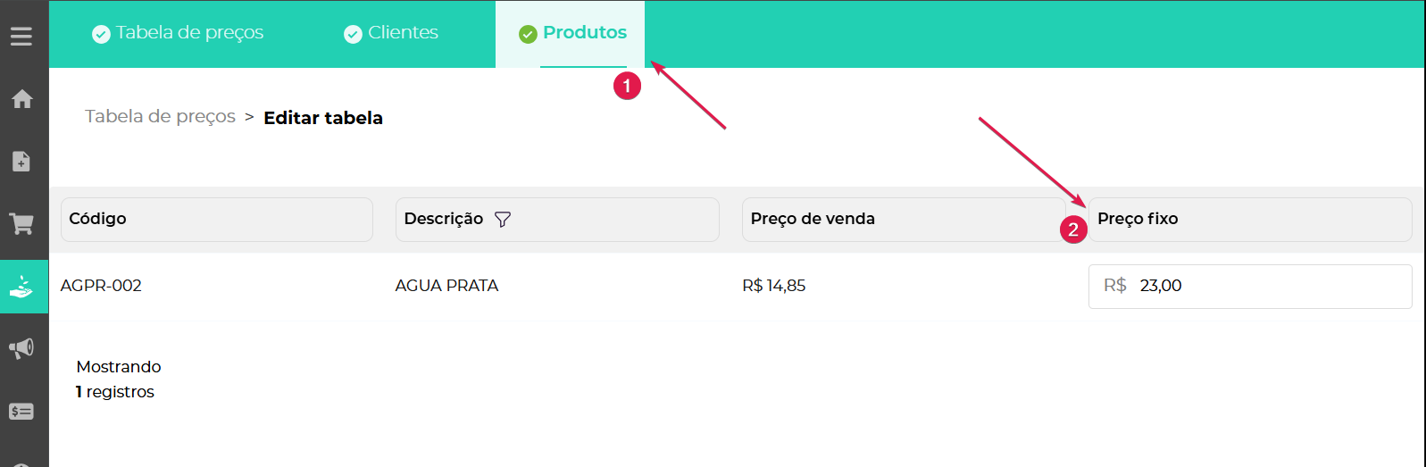 Ao selecionar a opção "Preço fixo" e salvar, você terá acesso a uma nova aba, onde pode preencher o preço que vai ser aplicado para cada produto.
