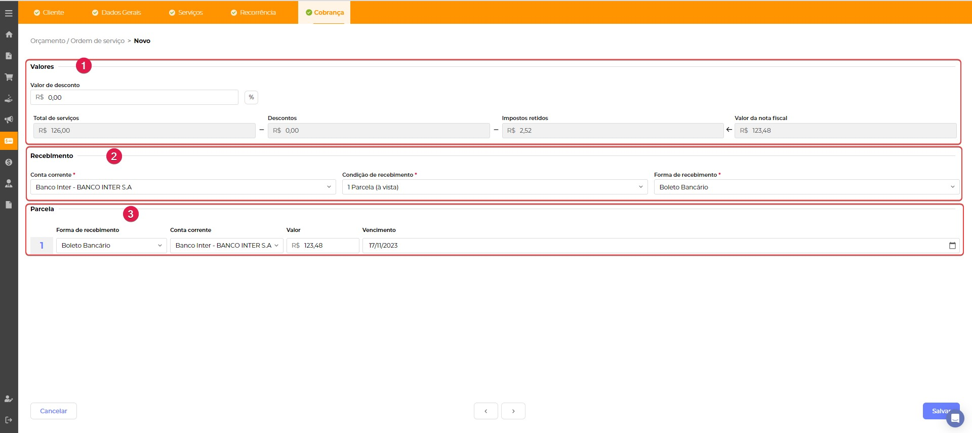 2. Recebimento: Definição da forma de recebimento da sua venda, como a conta corrente que será registrado, a condição do recebimento e a forma;