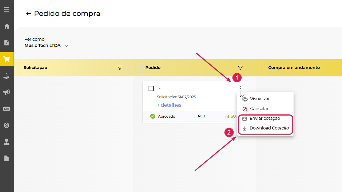 Quando seu pedido de compra está pronto, é o momento de disparar esse e-mail para seu fornecedor, para isso você vai clicar nos 3 pontos do pedido e escolher entre enviar a cotação por e-mail ou fazer o download.