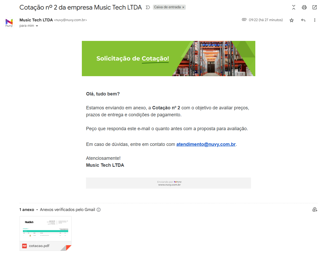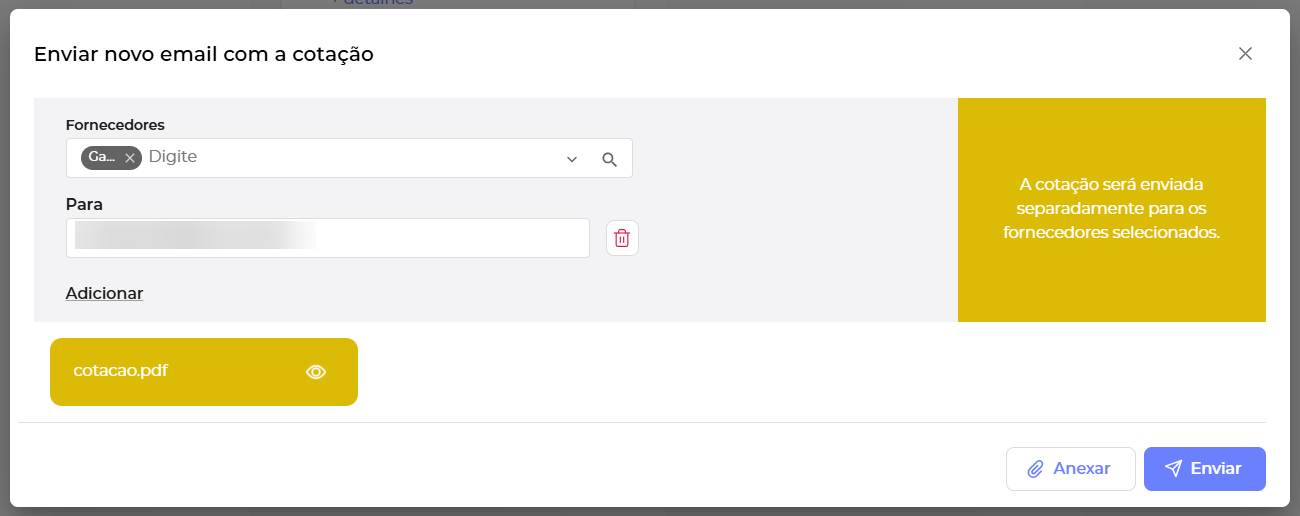 Após enviar seu fornecedor já vai receber o e-mail com a solicitação e a cotação em anexo.