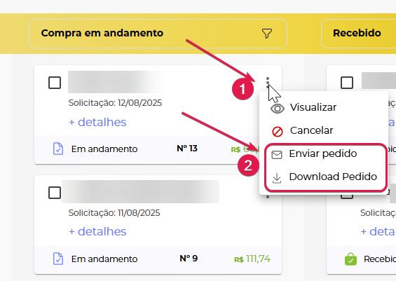 Quando seu pedido de compra está pronto, é o momento de disparar esse e-mail para seu fornecedor, para isso você vai clicar nos 3 pontos do pedido e escolher entre enviar pedido por e-mail ou fazer o download.
