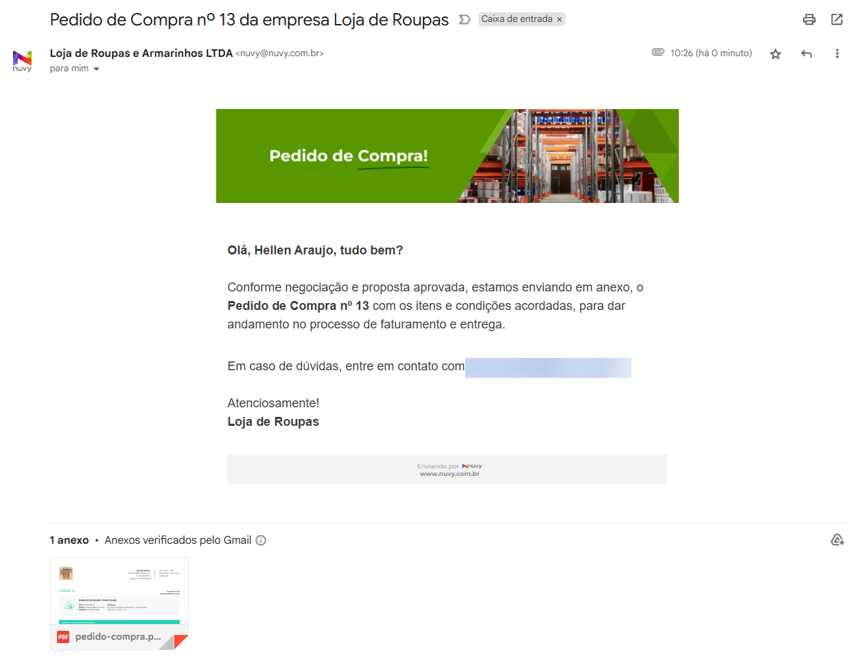 Após enviar seu fornecedor já vai receber o e-mail com a solicitação e o pedido em anexo.