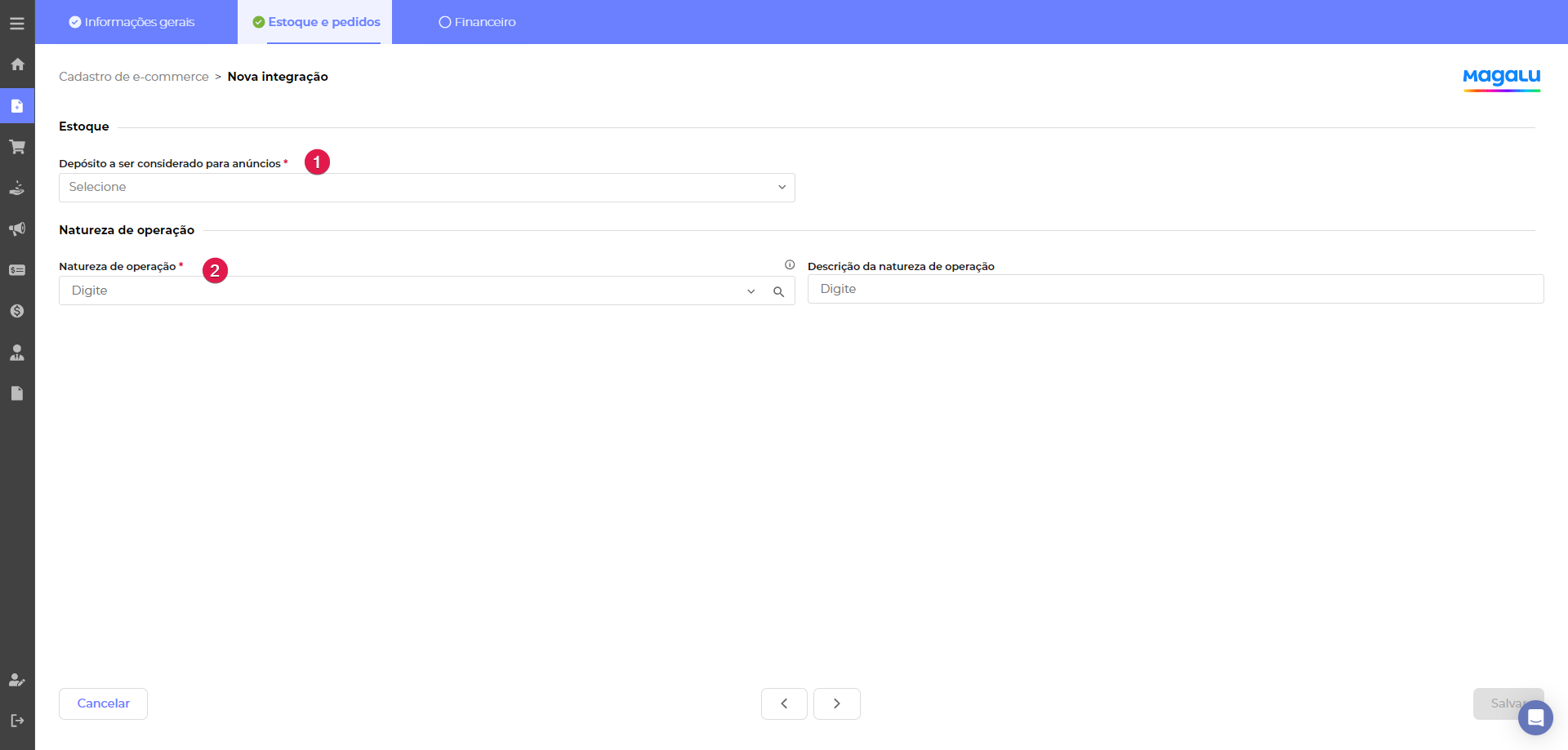 Natureza de operação: selecione a Natureza de Operação que irá ser adicionada em todos os pedidos da Magalu e preencha o campo da descrição, caso necessário;