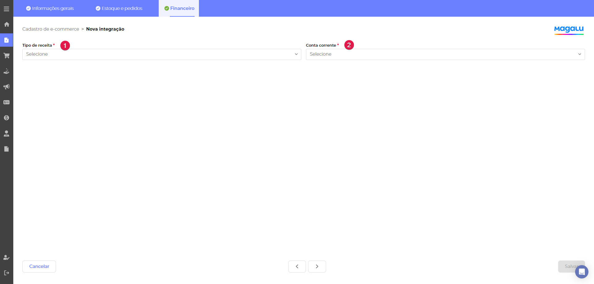 Tipo de receita: Selecione qual o tipo de receita principal que será utilizado para os seus pedidos de venda originados no Magalu;