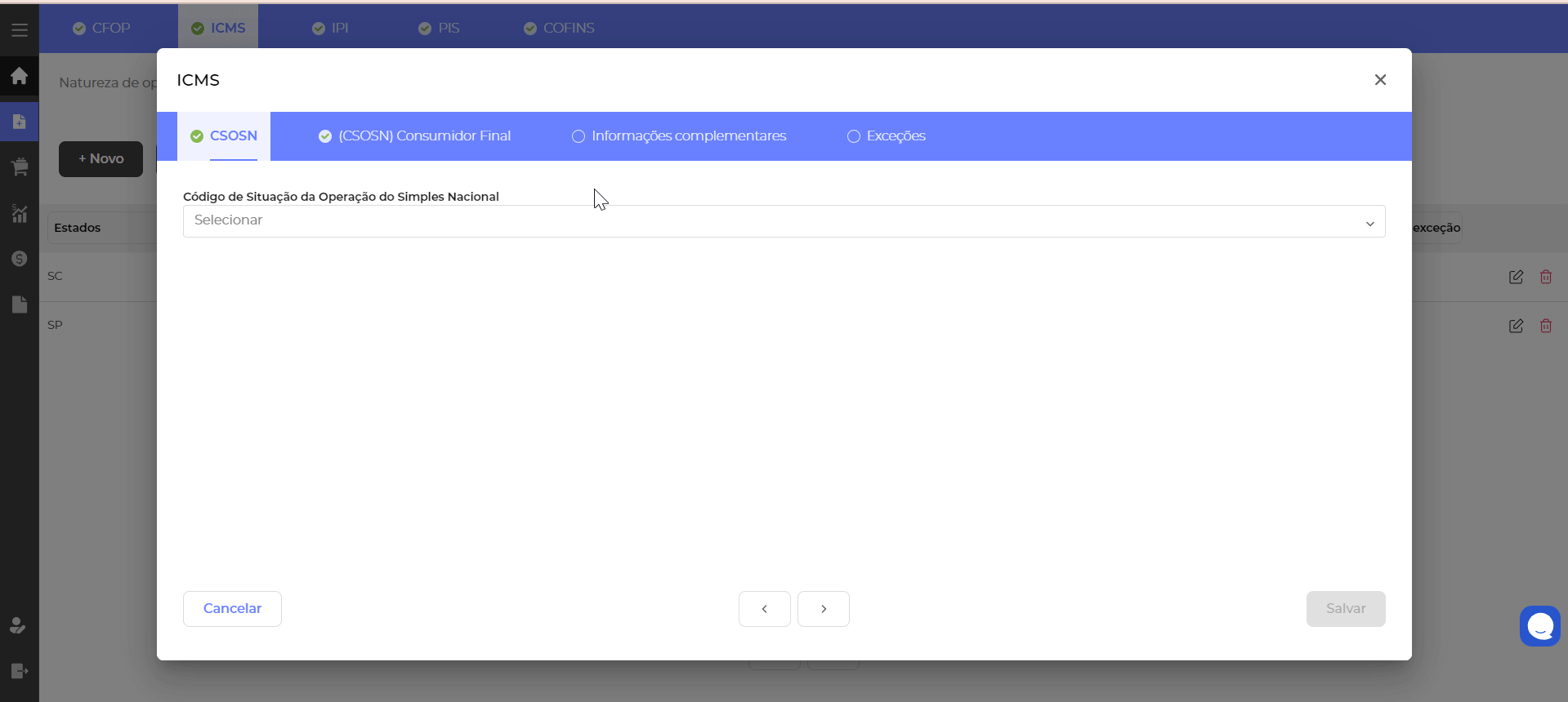 A sua regra de ICMS é única, mas ela pode ter um conjunto de itens separados por estados, dessa forma você poderá configurar individualmente a tributação para os estados em que opera. Após fazer a primeira configuração, basta clicar novamente em + Novo e selecionar outros estados para uma nova configuração de ICMS dentro da mesma natureza de operação.