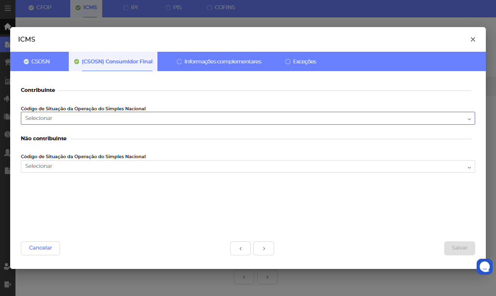 CSOSN (Consumidor final): aqui você vai configurar os parâmetros gerais de ICMS que serão utilizados para todas as vendas destinadas a clientes consumidores finais, separados por contribuinte e não contribuinte. No caso de operações interestaduais, a tela contempla o cadastro do DIFAL e DIFAL por ST conforme legislação vigente.