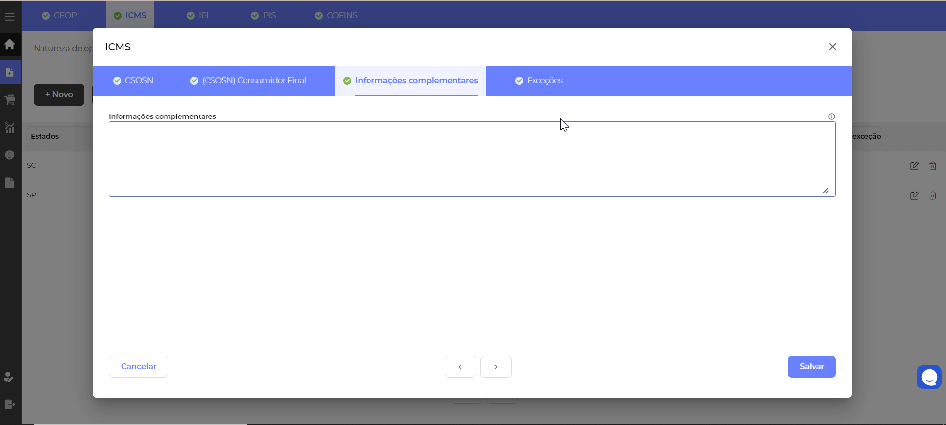 As abas de configuração de ICMS, possuem todos os campos necessários para uma correta configuração, desde o código de situação tributária, alíquotas e modalidade de base de cálculo, preencha cada um deles em conformidade com a sua operação.