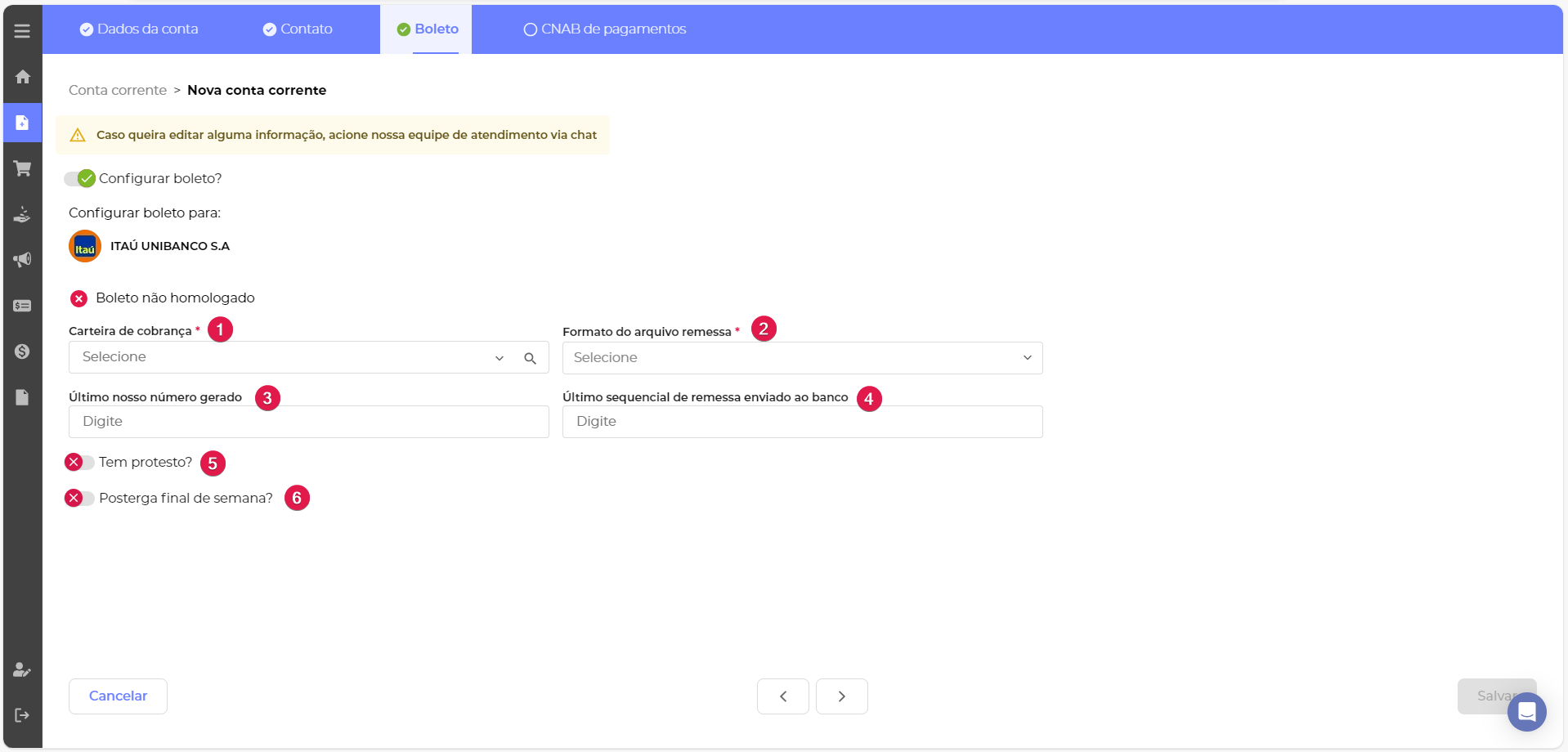 Na aba boleto, é possível realizar a configuração para sua conta corrente emitir o boleto por dentro do Nuvy ERP.