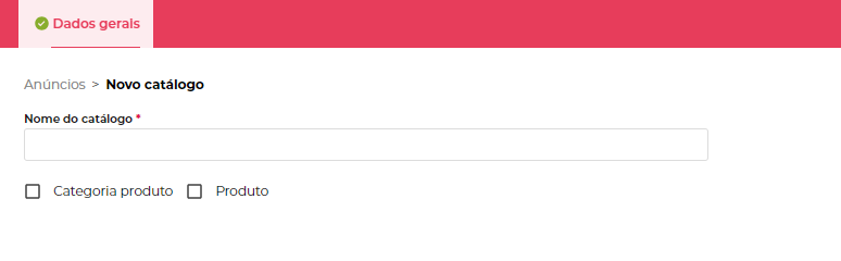 Clicando em Novo, podemos definir o nome do novo catálogo e definir se vamos incluir os produtos nesse catálogo a partir das categorias de produtos ou produtos avulsos.