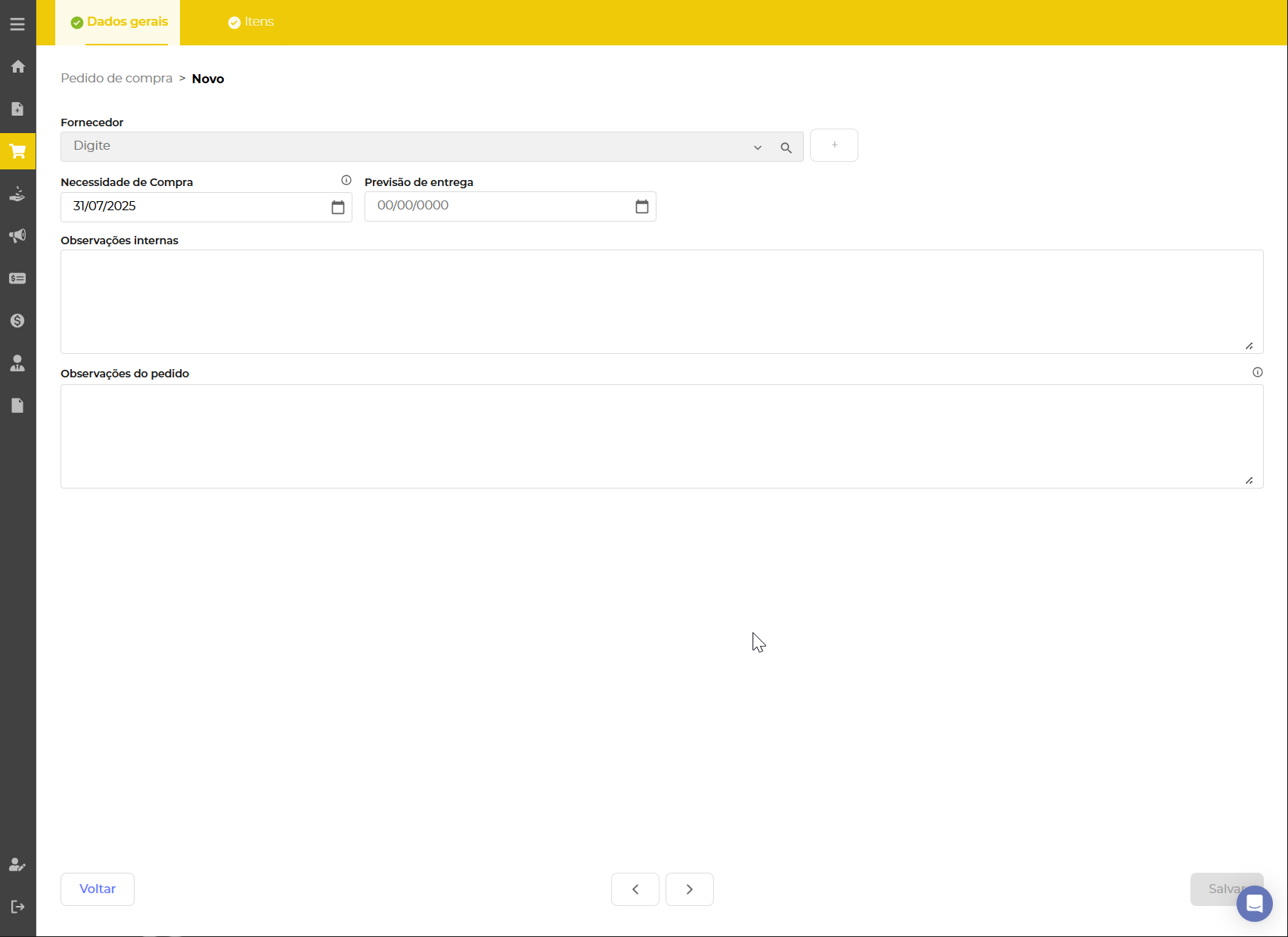 Nessa tela você vai definir qual é a data de necessidade de compra, incluir observações.