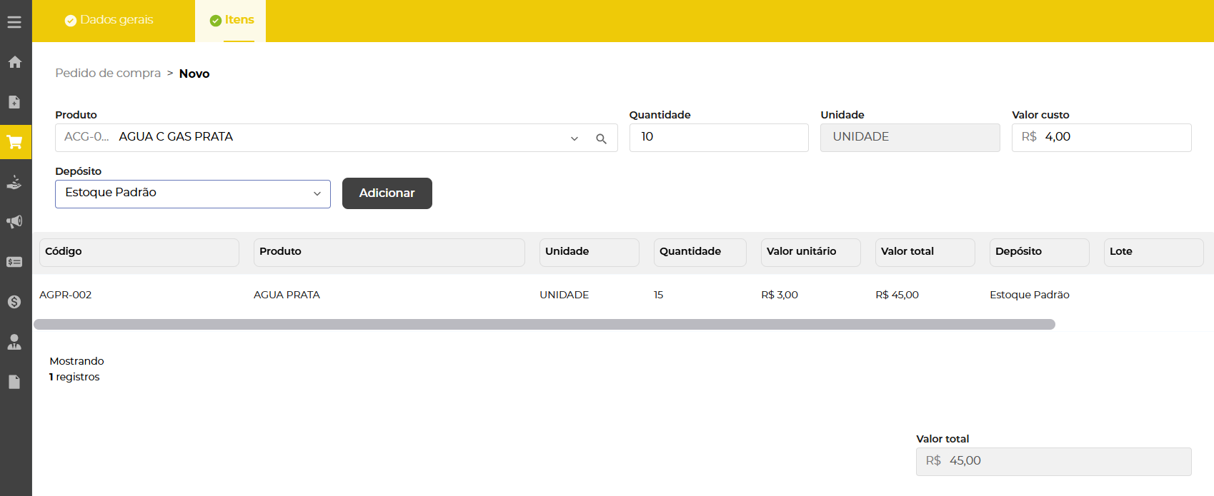 Na aba Itens você vai incluir todos os itens no seu pedido, selecionando o produto, quantidade, custo e depósito.
