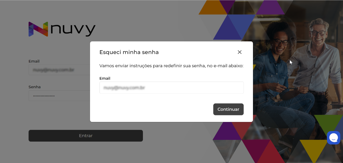 Na tela inicial de login do Nuvy ERP, clique no link de esqueci minha senha e preencha o seu e-mail de acesso: