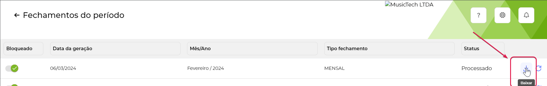 Podemos visualizar todos os períodos passados em uma lista, para baixar o os arquivos deste período basta clicar na opção baixar no final da linha desse período.