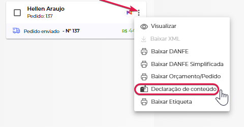 Com o pedido faturado basta clicar nos 3 pontos e selecionar a opção Declaração de conteúdo.