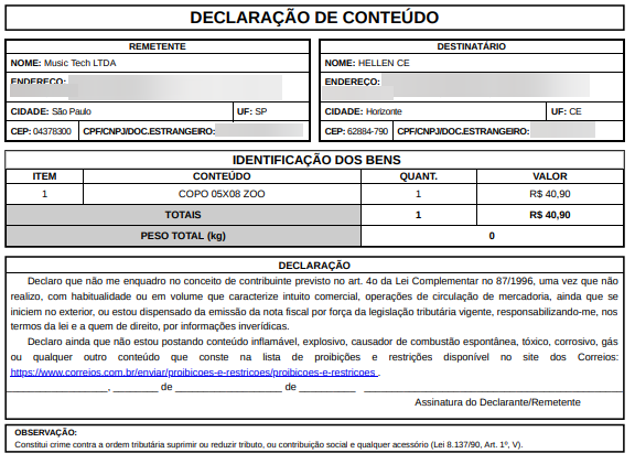 Como imprimir a declaração de conteúdo da sua venda