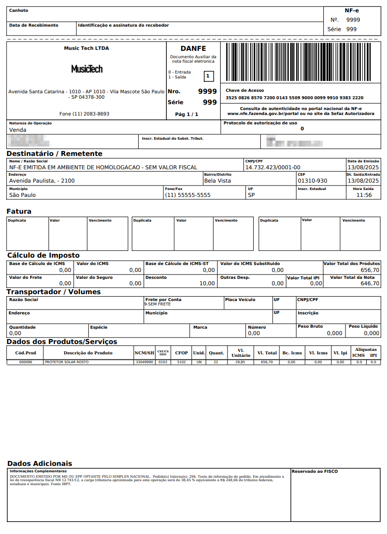 Dessa forma você já tem o arquivo de uma nota em homologação (sem valor fiscal) para que você possa conferir todos os dados e depois seguir com a emissão.
