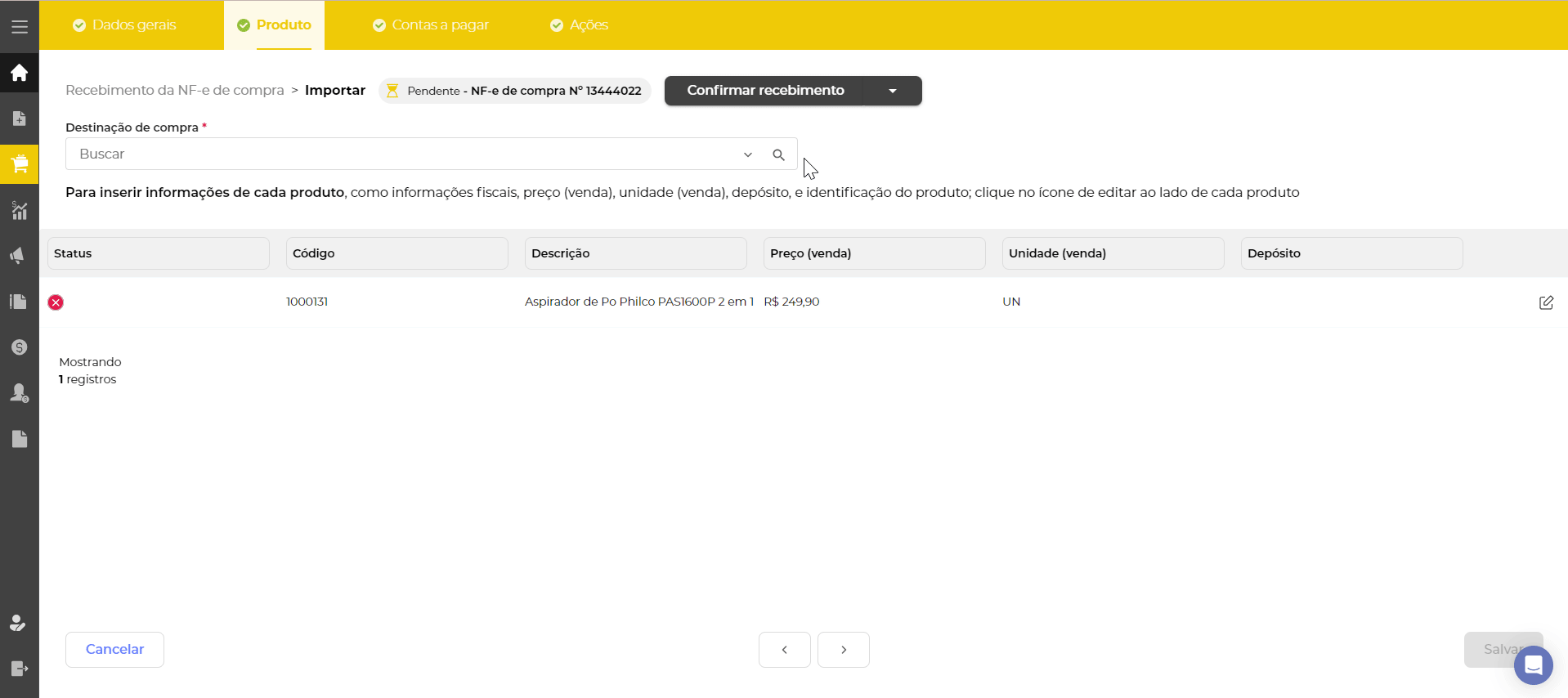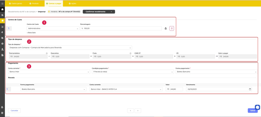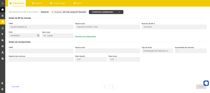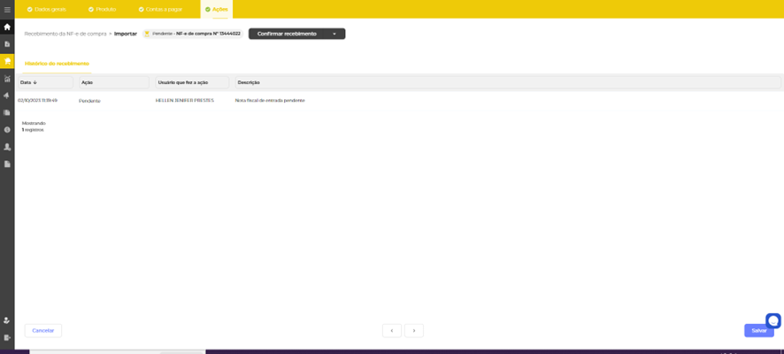 Ao clicar em salvar, a importação da NF-e será concluída na 1ª etapa.