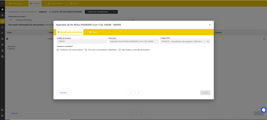 Cadastrar um novo produto: Quando o produto não está cadastrado no sistema, é possível realizar o cadastro a partir dessa opção.