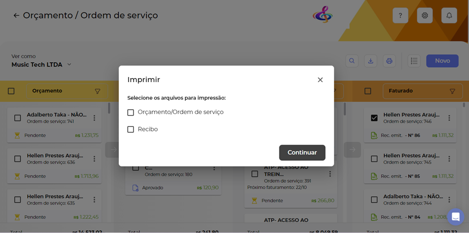 Se já estiver faturado, após clicar em imprimir é possível selecionar quais tipos de documentos serão impressos, podendo ser um ou mais documentos, como o orçamento/ordem de serviço, recibo ou nota fiscal.