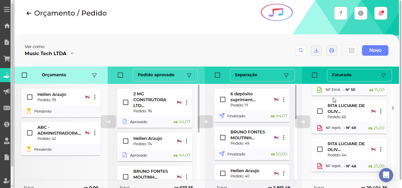 Nota Uma vez na coluna de faturada, o pedido não pode voltar para as outras etapas, mas se você precisar, poderá editar um pedido com status NF rejeitada. |