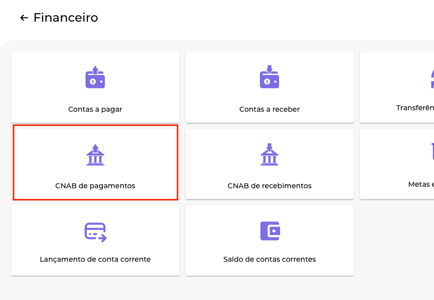 Após incluir as informações nos títulos, no módulo Financeiro, clique em CNAB de pagamentos: