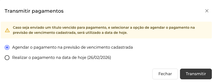 Ao transmitir você pode escolher o agendamento para a data prevista de vencimento do título ou a efetivação do pagamento na data de hoje: