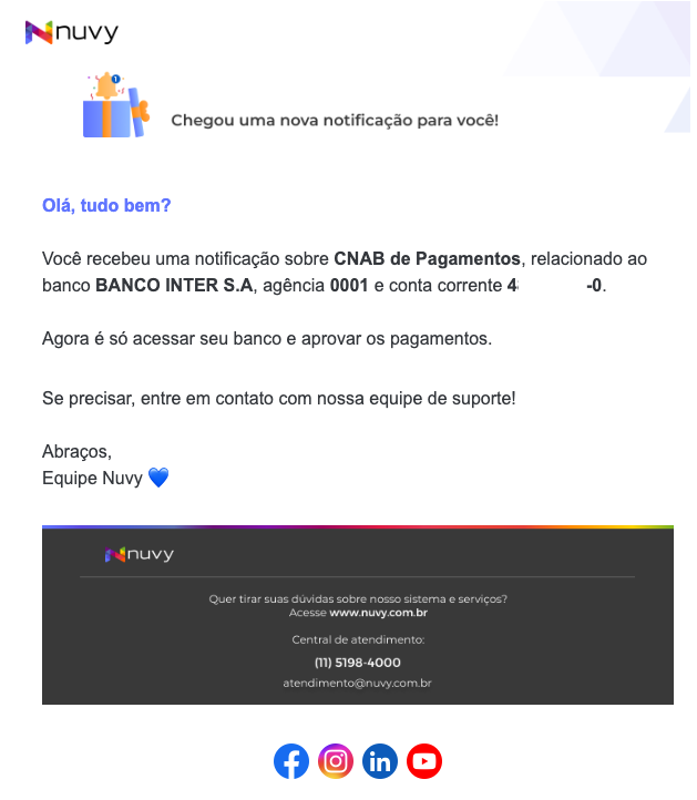 Depois de transmitir, o sistema envia as informações para o seu banco e o aprovador recebe um email de notificação para aprovar no Internet Banking ou aplicativo do seu banco: