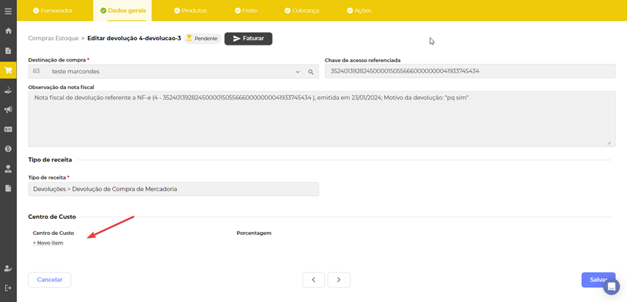 Aqui você pode preencher o Centro de custo se for o caso.