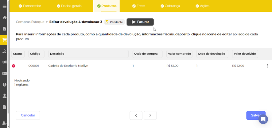 Assim que finalizar seus ajustes, você pode clicar em Faturar e pronto. Sua Nota de devolução está gerada.